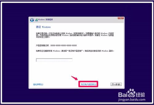 在Windows激活窗口,如果我们有安装Windows10系统的密钥,就输入密钥,点击:下一步;如果没有安装密钥,点击:我没有产品密钥;