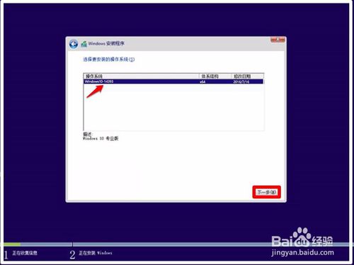 在Windows安装程序 - 选择要安装的操作系统窗口,点击:Windows10-14399,再点击:下一步;