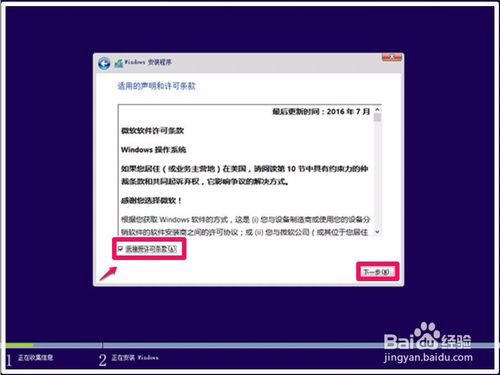 在Windows安装程序 - 适用的声明和许可条款窗口,点击:我接受许可条款,点击:下一步;