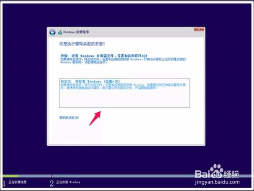 在Windows安装程序 - 你想执行哪种类型的安装窗口,选择并点击:自定义,仅安装Windows(高级);