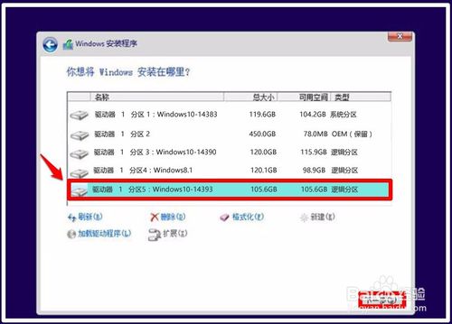 在Windows安装程序 - 你想将 Windows 安装在哪里窗口,我们可以选择安装到任何一个磁盘(软媒魔方硬盘装机的优点),现在选择点击:硬盘驱动器 1 分区 5...逻辑分区,点击:下一步;