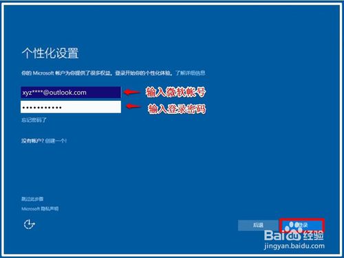 下面进行个性化设置,如果我们已经有微软帐号,可以在个性化设置窗口,输入微软帐号,如:xyz****@outlook.com,再输入电脑开机的登录密码(密码一定记住),点击:登录;