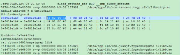 游戏变速通过GOT Hook 实现。首先注入lib9.so到游戏进程,然后修改游戏进程GOT中clock_gettime项为lib9.so中的0x42A4函数,图2为游戏进程被修改后的GOT,可以看到clock_gettime位于lib9.so进程空间。