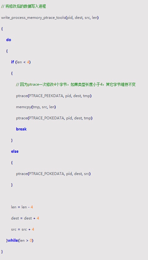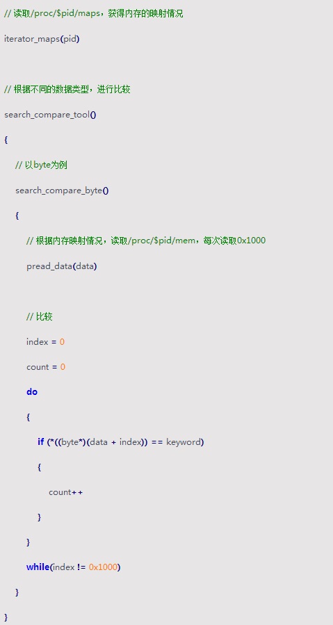 内存修改分两步,第一步搜索内存:以页为单位读取/proc/$pid/mem,查找指定数据并记录命中地址。因为查找过程中内存是动态的,所以显示时会调用ptrace(PTRACE_PEEKDATA),再读一次内存中的内容进行显示,这样可能出现命中列表中有些值不等于期望数据的情况;第二步修改内存:内存修改通过ptrace(PTRACE_POKEDATA)实现。下面给出内存修改的伪代码(函数经过重命名处理,详情见附带的idb文件):