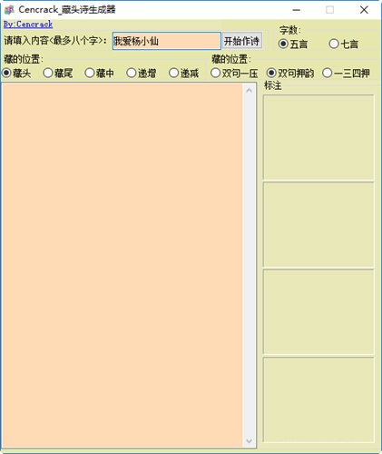 Cencrack藏头诗生成器是一款非常有趣的藏头诗软件,用户可以通过该软件自动生成妙意横生的藏头诗,而且还可以自由选择藏头、藏中、藏尾,单押或者双句押韵,非常适合表白时使用。
