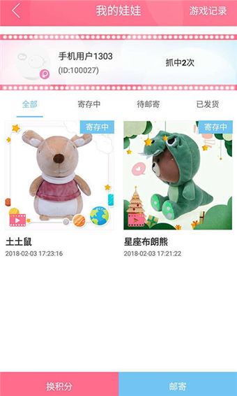 抓到的娃娃,我们全国免费包邮,APP查看物流信息,让你的激情变成真实的惊喜!