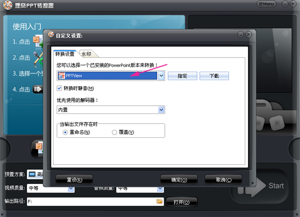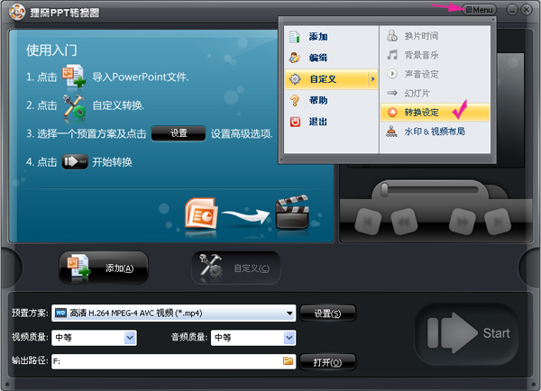登陆狸窝ppt转换器,Menu菜单选择自定义-转换设定,如下图所示: