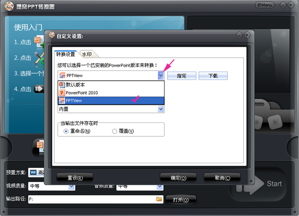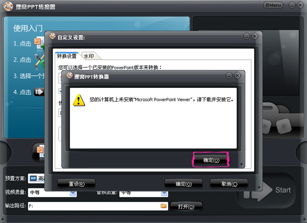 点击“确定”按钮下载并安装MicrosoftPowerPointViewer,下载后安装成功后!重启狸窝ppt转换器,再进入这一步选择PPTView,如下图所示: