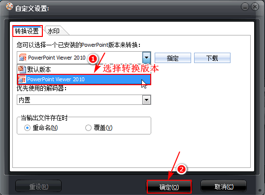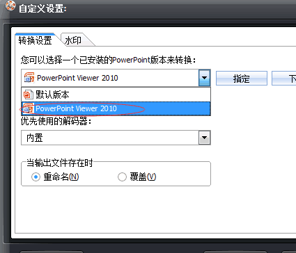 进入自定义设置界面,选择已安装的PowerPoint版本为“PowerPointViewer2010”,然后点击“确定”。如果没有安装PowerPointViewer,则这里就无法选择PowerPoint版本,所以大家不要忘记PowerPointViewer的安装操作。