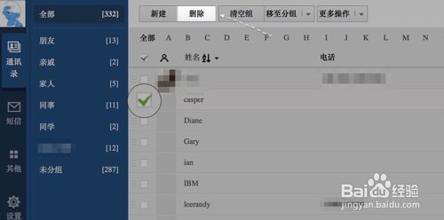 随后在联系人列表里,选中想要删除的联系人,再点击“删除”按钮。当然你也可以选择所有的联系人,做清空处理。