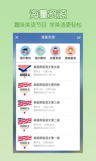 3、海量资源:趣味少儿和小学英语节目,中英对照,轻松愉快学习英语。