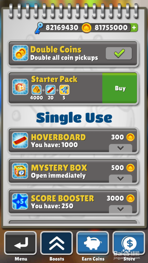 1:use 8 headstarts 使用8个黄色火焰道具[400一个×8个=3200,不划算直接购买1500] 就是在store里买那个叫headstart的东西(箭头样子)然后在游戏开始的时候上方会有headstart那个图标出现然后