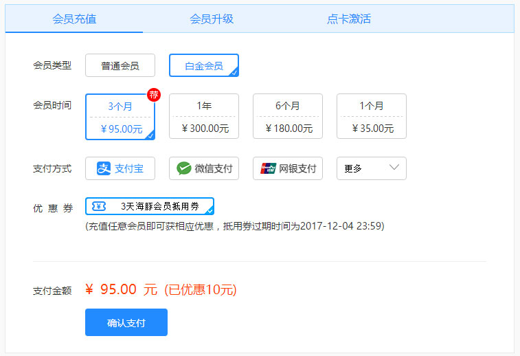 2、进入会员充值页面,系统会默认勾选使用海豚会员抵用券,充值任意会员,即可额外获得相应天数的海豚会员(赠送的会员跟充值的会员类型一致)。
