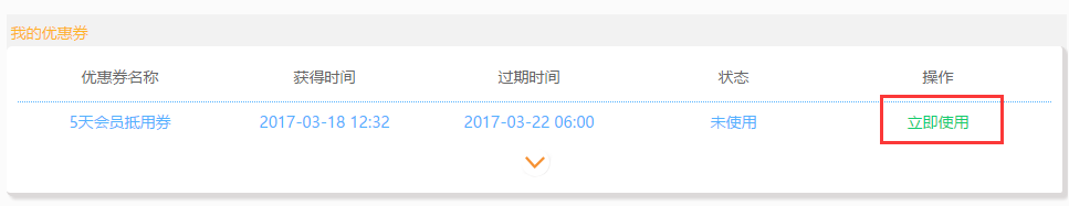 3、在用户中心,可查看抵用券的使用情况,以及抵用券的过期时间。如还没使用抵用券,可以点击立即使用,到会员充值页面充值任意会员,就能够额外获得海豚会员。