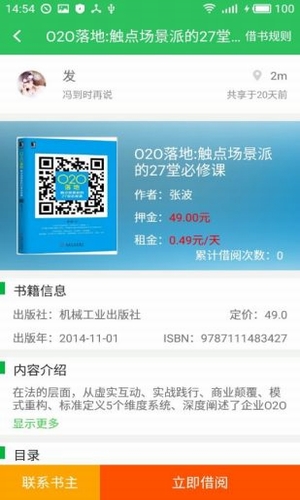 1.如何借书?找到您喜欢的书籍,点击?立即借阅?,支付该书的押金后,将会收到书主人的联系方式,您就可以与书主人约定取书时间和地点了。如果因为各种原因,您没能拿到书籍,您可以随时在?我借入的书?中申请退还押金。在您看完书之后,应该及时将书归还给书主人。书主人确认收到书之后,约书会全额退还书籍押金到您的账户,并根据实际借阅天数,从您的账户扣除租金。同时将租金转到书主人账户,一次完整的借阅流程就完成了。