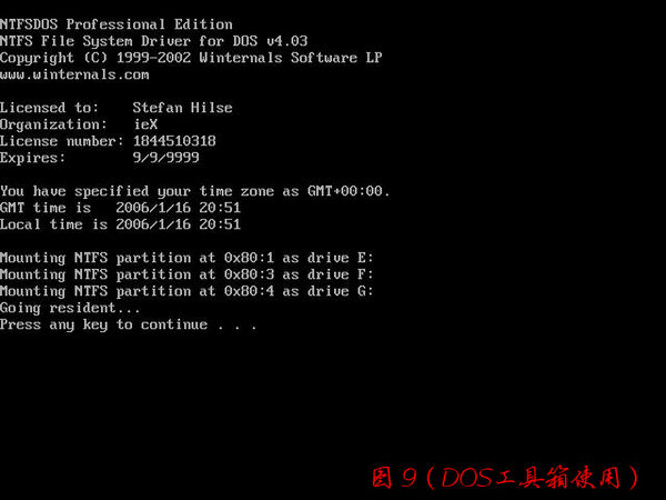 再按一下空格键使其前面的括号内出现“x”号,表示选中该项,如下图7所示: 上图显示∶进入DOS命令行,并加载NTFS分区支持。