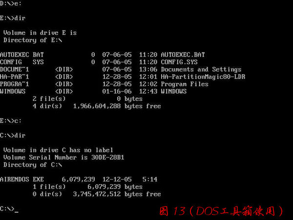 上图显示了E盘的内容,可见矮人DOS工具箱 V4.2对NTFS分区支持较好。看它是否同时对FAT32文件系统分区的支持如何:输入“c:”后回车,再输入“dir”回车,显示分区内容,如下图13所示: