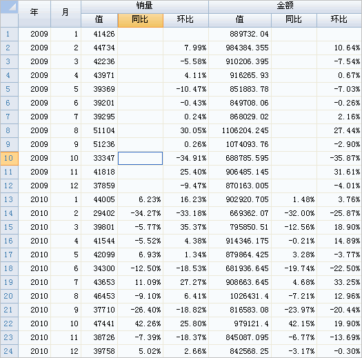 假定我们要根据订单表得到每月销售数量和金额,并计算出销量和金额环比增长率和同比增长率,这样的统计任务,即使是资深的程序员,也需要花相当长的时间才能完成编码工作,而且必须具备深厚的SQL语言基础: