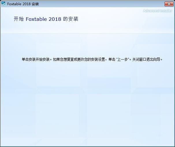 开始 Foxtable 2018 的安装。单击安装开始安装。如果您想复查或更改您的安装设置,单击“上一步”;