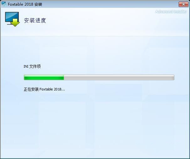 正在安装,安装程序正在将Foxtable的文件安装到指定文件夹中。安装Foxtable可能需要几分钟的时间;