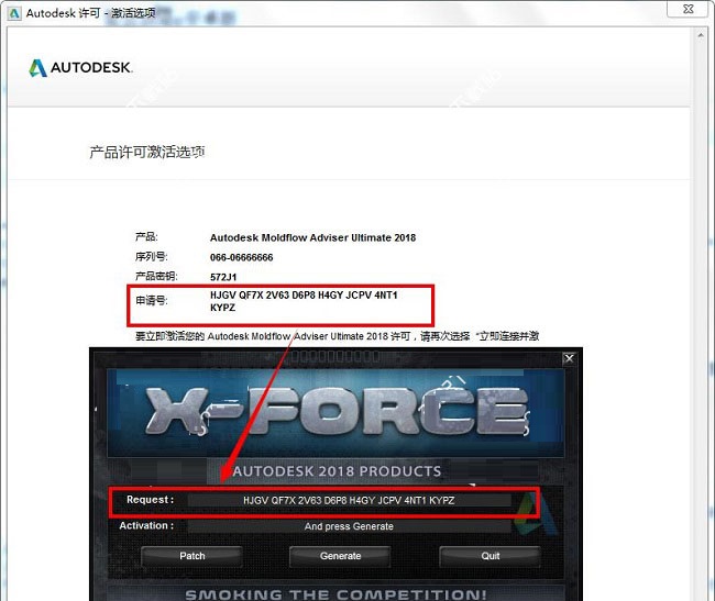 6、完成再将刚才复制的“申请号”粘贴到注册机中的“Request”栏中