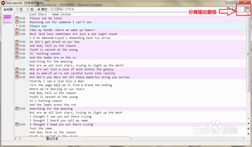 步骤一:打开会话操作界面,单击“打开文件”按钮选择需要合并的文本文件,单击文本合并输出窗格右上角”分离输出窗格“图标,随即文本合并输出窗格将会在一个新窗口打开,方便用户查看文本文件的细节差异,对于文本之间的冲突部分可以手动进行清除。