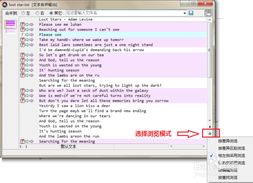 步骤二:单击下拉菜单底部的“选择浏览模式“圆形图标,展开浏览模式菜单,可选项内容包括:按差异浏览、按差异区段浏览、按左侧采用浏览、按右侧采用浏览、按编辑浏览以及按查找浏览。