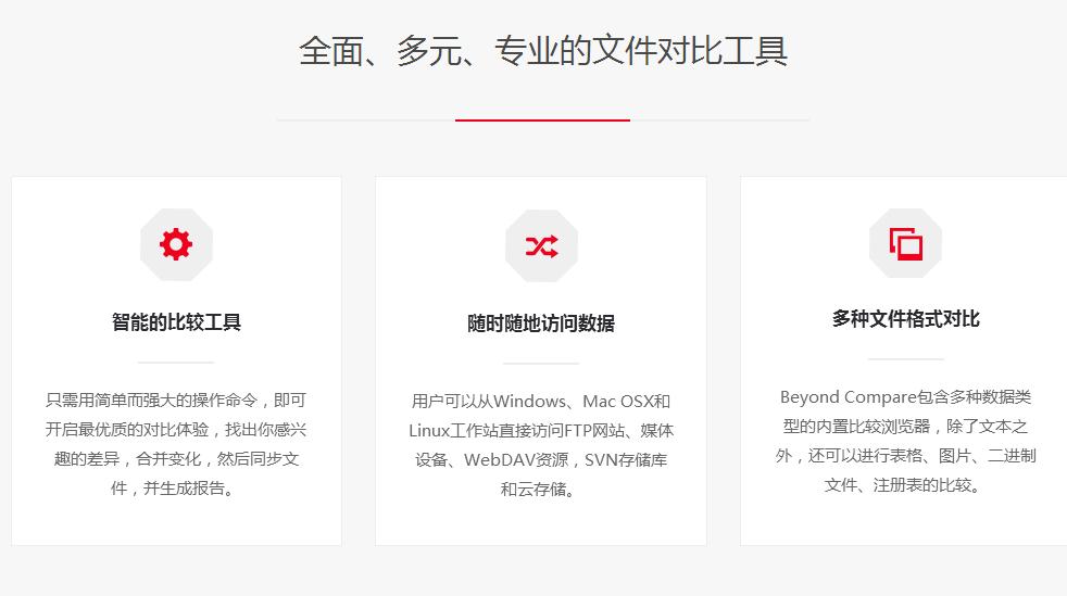Beyond Compare在Windows、Linux和OS X上都能使用。运行速度快,并且拥有一个本地界面。同时为了满足您完成任务的各种需求,还针对各种平台进行功能提升。