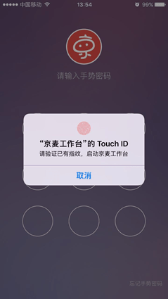 * 首次登陆京麦的账号需要设置手势密码,下次启动京麦输入手势密码就可以登录,支持指纹解锁的设备,也可以使用指纹解锁。