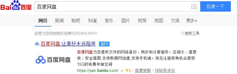 第一步,打开浏览器,在百度搜索中输入百度网盘进行搜索,然后选择百度网盘的官网点击进入(一般为搜索结果第一个),如下图所示: