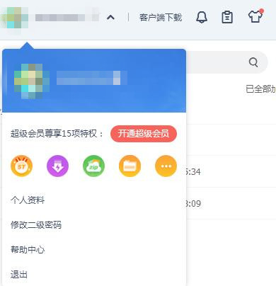 到网页右上角,可以进行帐号操作,如开通超级会员、查看个人资料,修改二级密码,同时还能下载客户端,查看系统通知,反馈意见,进入皮肤中心。