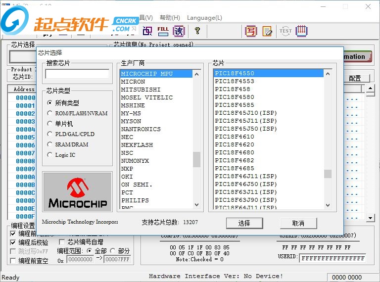 2、可以快速的对您需要的芯片进行选择,包括了生产厂商、芯片、芯片的类型选择;