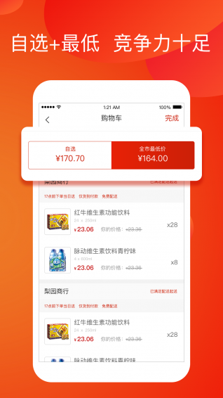 一键解决复杂的比价流程,可查看全市最低价,同时展示购物车总商品数量。