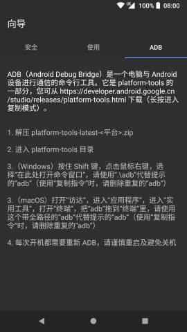 黑阈支持 Android 5.0 到 8.1,不需要 Root,但是依赖“开发者选项”中的“USB调试”。如果设备支持网络调试,开启之后黑阈会自动激活。