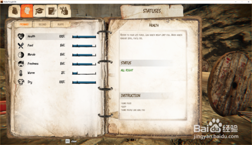 3、第二页是当前人物的状态,包括健康,饥饿,士气,新鲜感,温暖,干燥度几个指标。