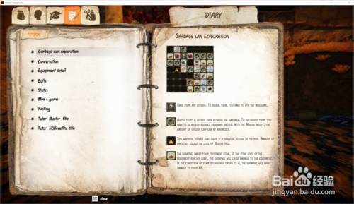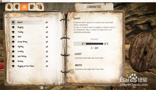 4、第三页是自己的各项能力,包括口才,乞讨,交易,偷盗,捡垃圾,打架,手工艺,撬锁,街头卖艺,下跪乞讨等,可能我翻译的不准确,但大致就是对于一个流浪汉来说使自己更容易生存下来的各种能力。