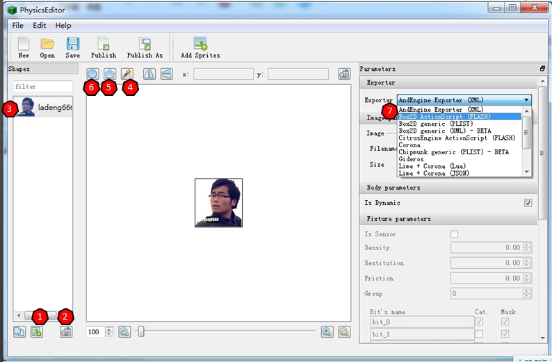 上面的步骤都完成后,选择图1中的7处为”Box2D ActionScript(Flash)”,然后点击左上方的Publish按钮,就可以导出PhysicsData类了。