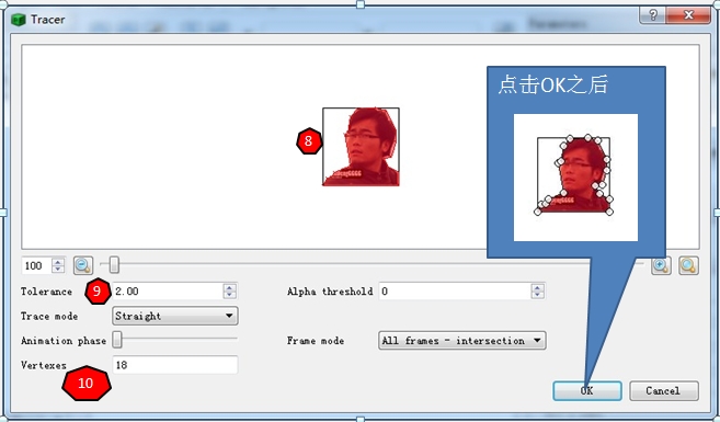 上图中的8处所示,是PE自动追踪图片边缘的效果。9处可以设置顶点之间的距离,这个值越小,顶点间距越小,多边形越接近图片的形状,同时消耗CPU也越多,所以不必过度要求多边形的精度,大体形状差不多就行。9处设置好后,PE会自动计算出顶点的个数,并显示在10处。