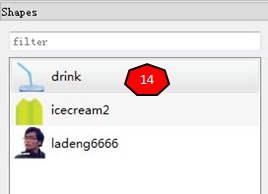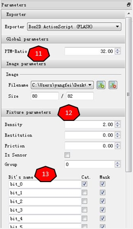 PE帮我们追踪完图片边缘后,右侧会显示该多边形的信息。11处是像素与Box2D中的m之间的比例,默认为32,但是我们一直用的都是30。12处是刚体的弹性、摩擦力、密度、isSensor信息,和b2Fixture里是对应的。13处是组成该多边形的子刚体的信息,每个刚体后面的选项是指碰撞过滤信息,Cat是指category刚体碰撞分组,Mask指刚体碰撞过滤,
