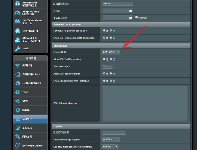 手动安装shadowsocks 首先刷好梅林之后进入系统设置界面,在Enable SSH里选择LAN ONLY,其它不用动,选择下面的应用设置。
