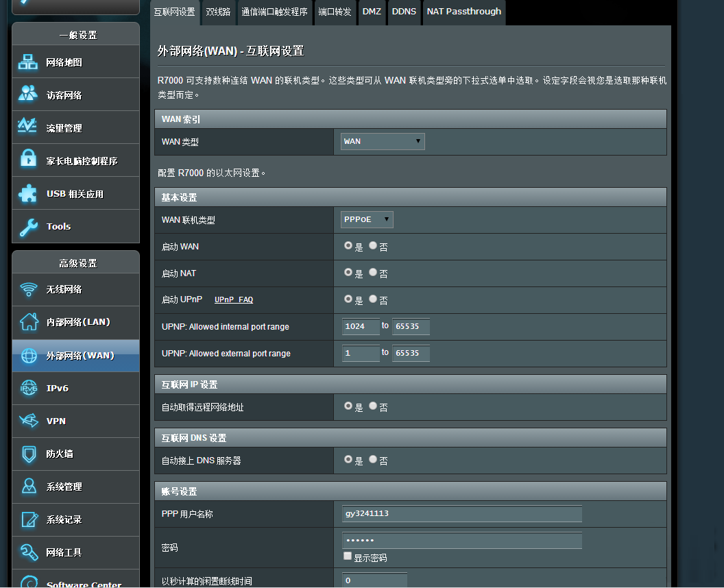 打开 外部网络-互联网设置-WAN索引先选择WAN 填上宽带账号和密码