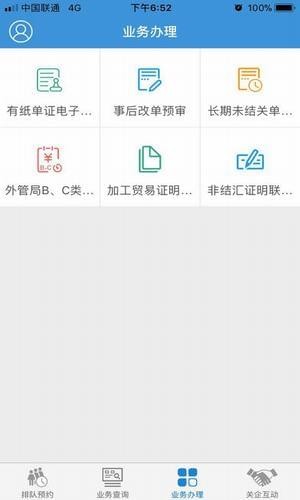 “排队预约”:通过提前网上预约,按时现场办理,有效缩短现场等候时间,远离排队烦恼,实现业务办理“零等候”。“业务办理”:“外管局B、C类收汇核销联”、“加工贸易证明联”、“非结汇证明联”等办事模块,提前网上申请,凭海关作业完成后推送的二维码直接领取,实现业务办理“跑一次”;“有纸单证电子化申请”、“事后改单预审”、“长期未结关单证原因反馈” 等办事模块,提前上传资料,根据海关预审结果,及时补充、修改相关材料,完成预审后现场快速办理,实现业务办理“一次跑”。
