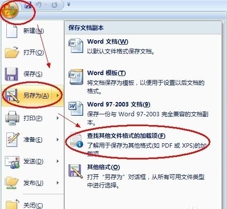 首先点击word2007最左上角图片下拉菜单——》另存为——》查找其他文件格式的加载项,如下图: