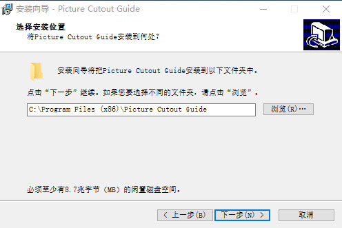 接下来就要注意选择安装路径,默认是C:\Program Files (x86)\Picture Cutout Guide,你可以改成D:\Program Files (x86)\Picture Cutout Guide