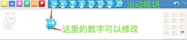 每个新的scratchjr项目都会默认一个小猫角色。为了使猫移动,我们可以使用程序块中蓝色调色板中的运动模块,用手指拖动一个蓝色箭头块到编程区域。所有的scratchjr程序都会在屏幕中央播放,我们称这个地区为舞台。