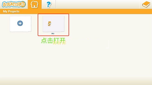 第一步:打开scratchjr我们会看到上一节保存好的项目“舞会”,点击打开这个项目。