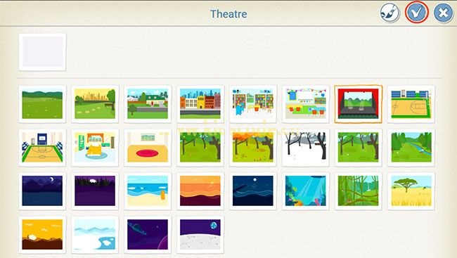 你会看到很多背景,你可以选择。为了我们跳舞的猫,让我们选剧院吧,再点击顶部的对勾标记将它载入你的舞台。