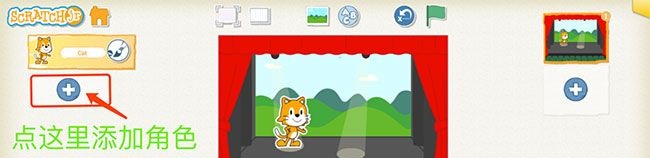 现在舞台上有两个角色。在舞台的左边是角色区,它显示了你项目中所涉及的所有角色。新角色总是出现在舞台中央,移动角色,用手指把它拖到舞台上。我们把每个角色都拖到聚光灯下。