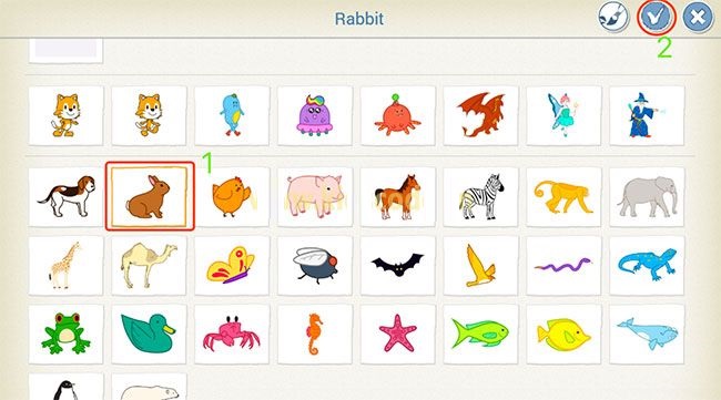 这个操作与添加背景一样,我们会看到很多角色,挑选一个你喜欢的(我选择了兔子),然后点击对勾,添加到我们的舞台上。