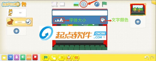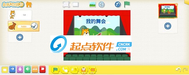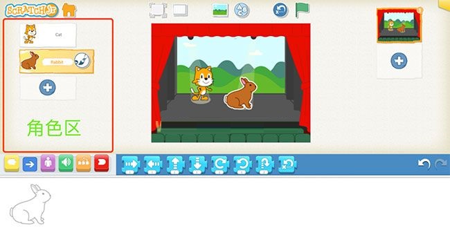您可能会注意到,您为猫编写的脚本在选择了一个新角色之后就消失了。别担心,脚本还在那里!它在猫的脚本区里,现在屏幕显示的是兔子的脚本。每个角色都有自己的脚本。要查看猫的脚本,在左边的角色区域点击猫,你会看到你的脚本还在那里。然后再选择兔子,这样你就可以给它设计舞台动作了。